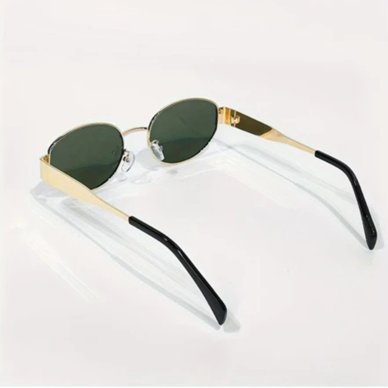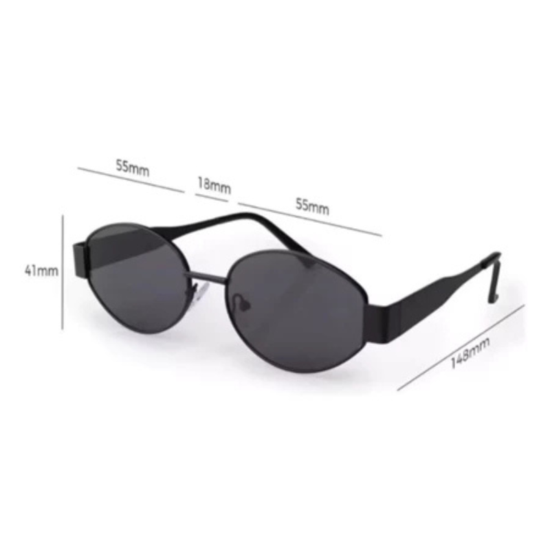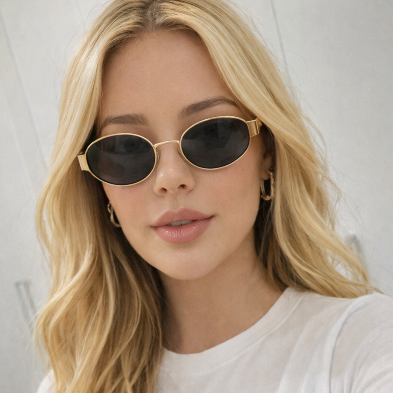 O formato oval com armação metálica resgata uma estética retrô que voltou ao centro das tendências de moda feminina. Esse modelo valoriza o rosto, adiciona personalidade ao visual e combina com produções casuais, praia e looks urbanos. Uma escolha estética que conversa diretamente com o estilo atual.
